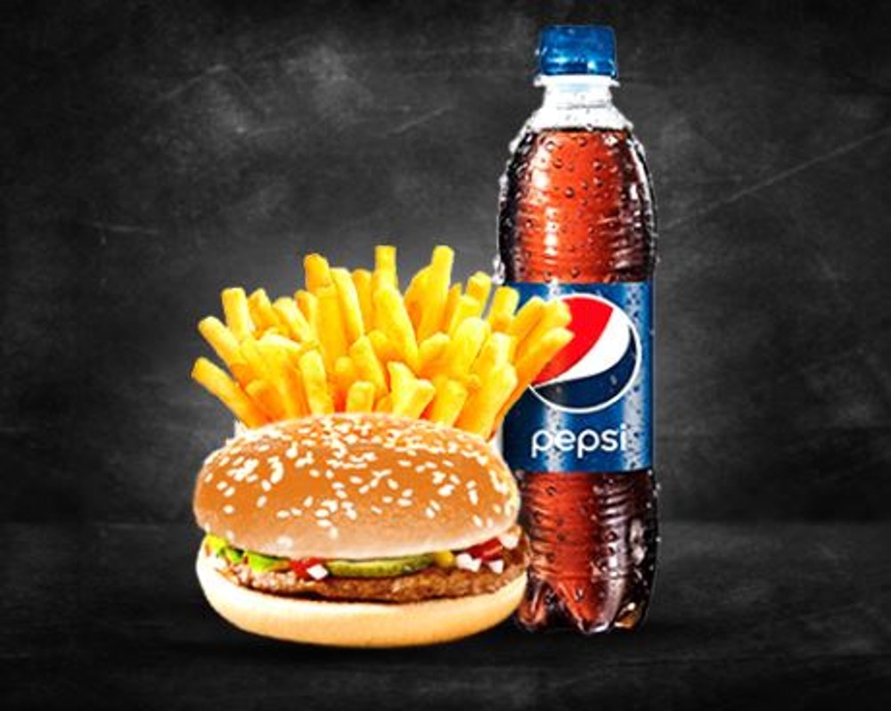 Соковитий, насичений смаками з прожареною котлетою з яловичини бургер, порція відбірної картоплі фрі та напій Pepsi зазвичай викликає ситість та задоволення від прийому їжі.