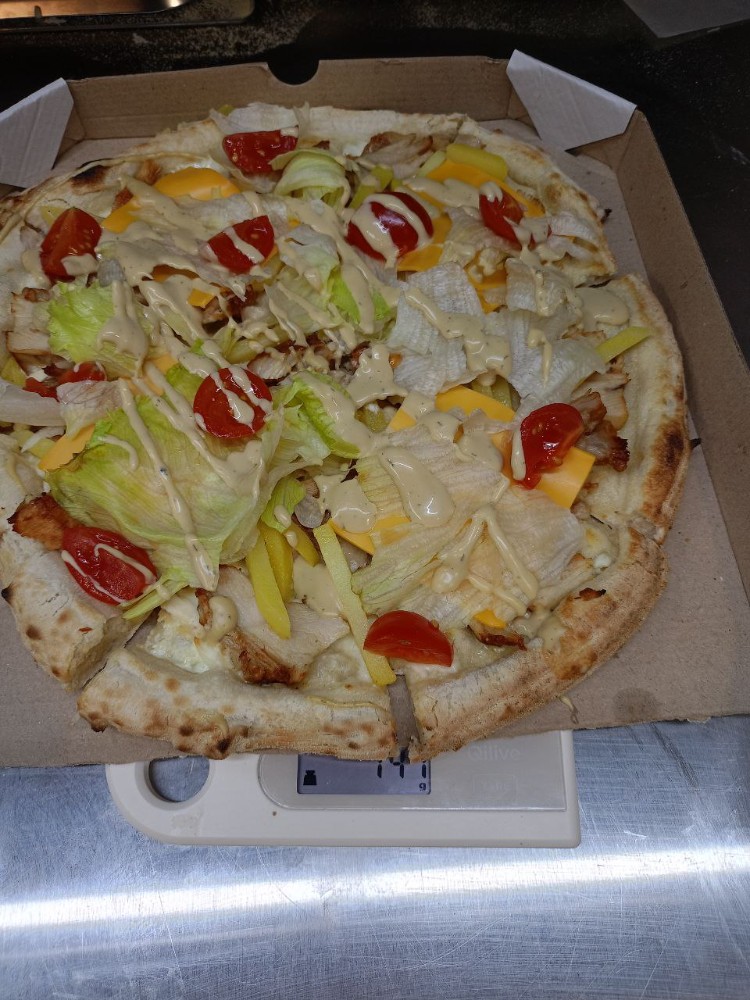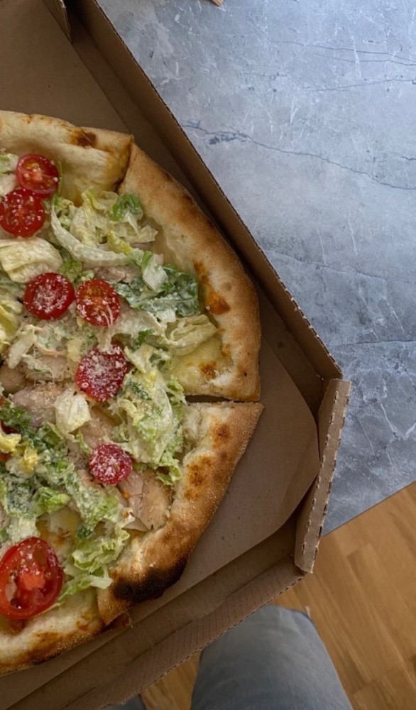 Наша версія салату у форматі піци: випікаємо основу з моцарелою та курячим філе на вершковому соусі, а після печі додаємо салат-мікс, томати чері, пармезан і соус «Цезар». Легка, соковита й ароматна. Інгредієнти: тісто пшеничне, вершковий соус, моцарела, куряче філе, салат-мікс/ромен, томати чері, пармезан, соус «Цезар», часникова олія, спеції. Ø30 см. Доставка по Борщагівці або самовивіз