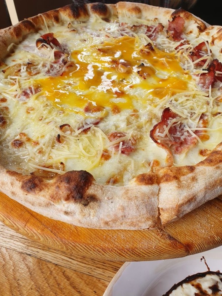 Натхнення з пасти Карбонара: бекон і шинка, печериці, вершковий соус і моцарела. Насичена, зі збалансованою солонкавістю та вершковим післясмаком. Інгредієнти: тісто пшеничне, вершковий соус, моцарела, бекон, шинка, печериці, цибуля. Ø30 см. Доставка по Петропавлівській Борщагівці або самовивіз на парковці Ельдорадо та території мінімальних цін в щазкладі Сімейна Шаурма